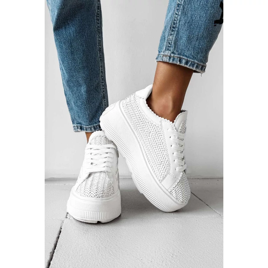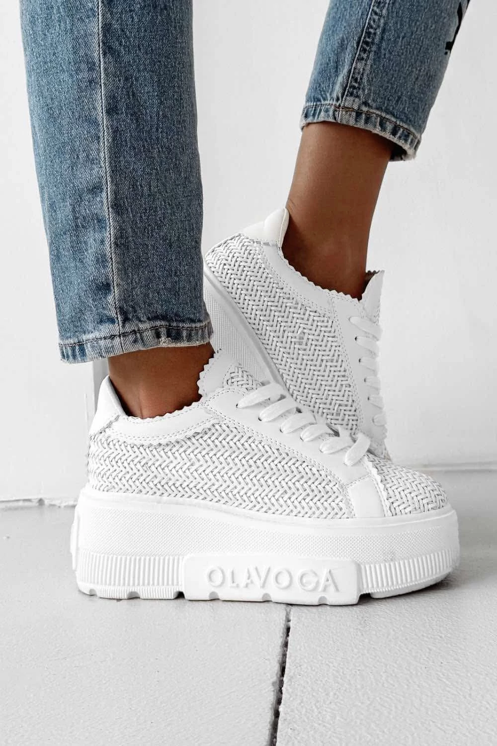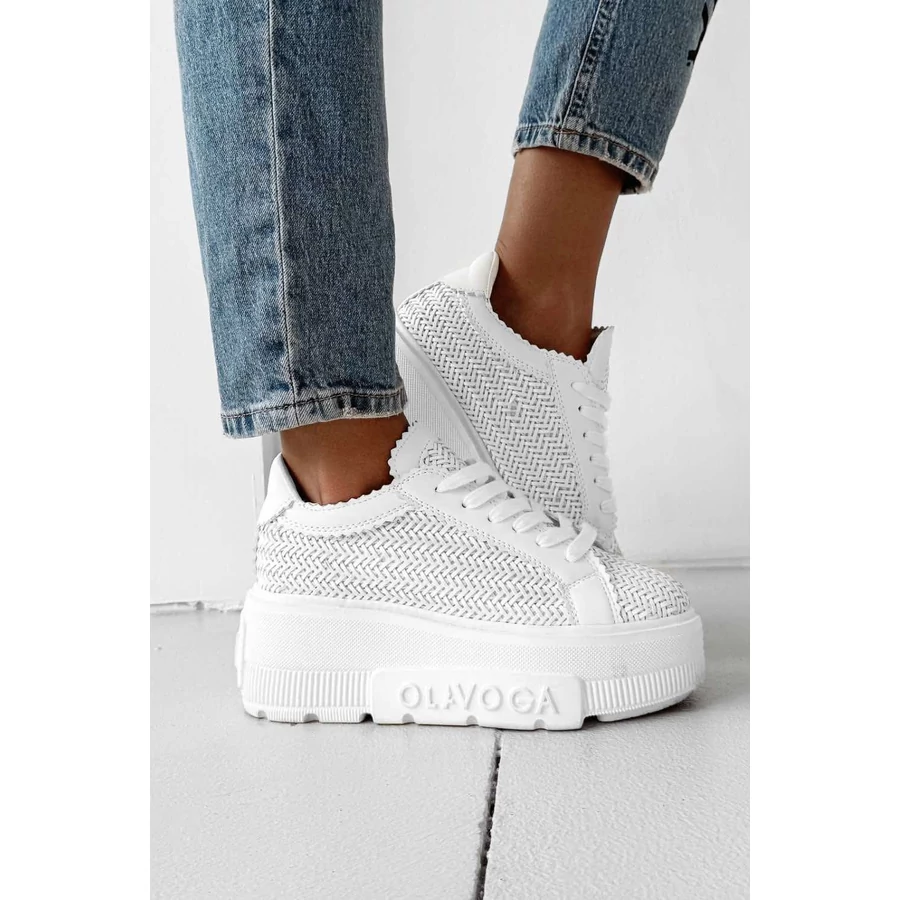 Casual stílusú sneakers cipő masszív platformtalppal, egyedi textúrájú, fonott anyagból. A modellt sima bőrből készült részletek emelik ki a nyelvnél, a sarokrészen és a fűzők körül. Az oldalán dombornyomott OLAVOGA logó, a sarokrészen pedig letisztult OLV felirat található. A markáns mintázatú, logózott talp jó tapadást és stabilitást biztosít. A fűzős kialakítás enyhén nyers szélű nyelvvel teszi teljessé a karakteres megjelenést.